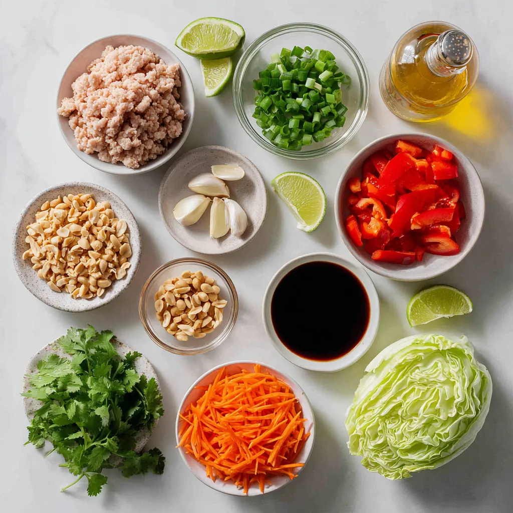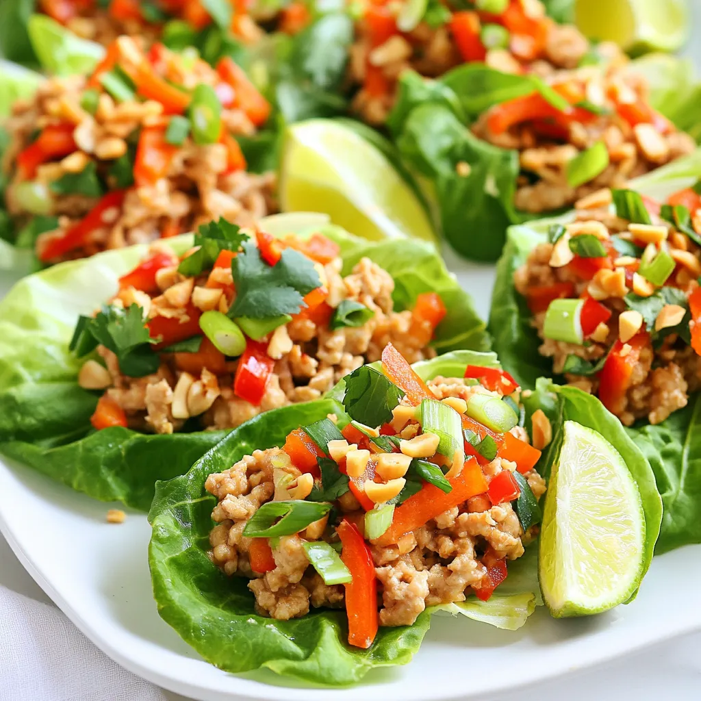 - 1 lb ground chicken - 1 tablespoon vegetable oil - 2 cloves garlic, minced - 1 tablespoon fresh ginger, grated - 1 red bell pepper, finely diced - 1 carrot, julienned - 3 green onions, sliced - 1/4 cup fresh cilantro, chopped - 1/4 cup crunchy peanut butter - 2 tablespoons soy sauce - 1 tablespoon lime juice - 1 tablespoon honey - Salt and pepper to taste - 1 head of iceberg lettuce (for wrapping) The ground chicken is the heart of this dish. It cooks up tender and absorbs all the flavors. Fresh vegetables add crunch and color. The red bell pepper and carrot bring sweetness. The green onions and cilantro offer fresh notes. The peanut sauce is where the magic happens. It combines peanut butter, soy sauce, lime juice, and honey. This mix gives a rich flavor that ties everything together. - Crushed peanuts - Lime wedges - Fresh cilantro Garnishes add the finishing touch. Crushed peanuts give a great crunch. Lime wedges add zing and brightness. Fresh cilantro enhances the flavor and looks nice on the plate. - Large skillet - Spatula - Measuring cups and spoons You need a large skillet for cooking. The spatula helps mix everything well. Measuring cups and spoons ensure you use the right amounts. This keeps your dish balanced and tasty. These ingredients and tools make the process smooth and fun. You’ll enjoy every bite of your Thai Peanut Chicken Lettuce Wraps! {{ingredient_image_1}} First, heat 1 tablespoon of vegetable oil in a large skillet over medium heat. Next, add 2 cloves of minced garlic and 1 tablespoon of grated fresh ginger. Cook these for about 1 minute until they smell great. Now, add 1 pound of ground chicken to the skillet. Break it apart with a spatula and cook until it's browned, about 5-7 minutes. Once the chicken is ready, toss in 1 finely diced red bell pepper and 1 julienned carrot. Cook these for 3-4 minutes until the veggies soften. In a small bowl, mix together 1/4 cup of crunchy peanut butter, 2 tablespoons of soy sauce, 1 tablespoon of lime juice, and 1 tablespoon of honey. Add salt and pepper to taste, then stir until smooth. Pour this sauce over the chicken mixture in the skillet. Stir it all together until the chicken and veggies are well coated. Remove the skillet from heat and add in 3 sliced green onions and 1/4 cup of chopped cilantro. Your filling is ready to scoop into the lettuce wraps! To make your Thai Peanut Chicken Lettuce Wraps shine, you can adjust spice levels. If you want more heat, add a splash of sriracha or chili flakes. Start small and taste as you go. This way, you can find the perfect balance for your palate. Enhancing the peanut flavor is key too. You can mix in a bit of sesame oil with the peanut butter. It adds depth and richness. You can also toast crushed peanuts before sprinkling them on top. This will give a nice crunch and extra flavor. Arranging the wraps attractively can elevate your meal. Use a large, vibrant platter to display the filled lettuce leaves. Garnish with lime wedges and extra cilantro for a pop of color. This not only looks good but also invites your guests to dig in. For side dishes, consider serving fresh spring rolls or a light cucumber salad. Both pair well with the wraps and add a refreshing element. You can also offer a simple rice dish on the side to round out the meal. Meal prepping ingredients can save you time. Chop your veggies and store them in the fridge for up to three days. Cooked chicken can also be prepped in advance. This way, you can whip up your wraps in no time. Using pre-cooked chicken is another great hack. You can find rotisserie chicken at most stores. Just shred it and mix it in with the other ingredients. This will cut down your cooking time even more and keep the dish delicious. Pro Tips Use Fresh Ingredients: Fresh vegetables and herbs enhance the flavor and texture of your wraps. Opt for vibrant produce for maximum taste. Customize Your Sauce: Adjust the sweetness or saltiness of the sauce to your preference by adding more honey or soy sauce as desired. Make Ahead: Prepare the chicken mixture in advance and store it in the fridge. Assemble the wraps just before serving to keep the lettuce crisp. Experiment with Toppings: Add additional toppings like shredded cabbage, sliced jalapeños, or a drizzle of sriracha for extra flavor and crunch. {{image_2}} You can use ground turkey instead of chicken for a lighter twist. It tastes great and keeps the dish healthy. If you want a vegetarian option, try tofu. Firm tofu works best. Just cube it and sauté until golden. Both options add a unique flavor while keeping the wraps fresh. Switch up the colors of your bell peppers. Yellow or green bell peppers can add a fun look and taste. You can also add other veggies like zucchini or mushrooms. These add extra crunch and nutrients. Feel free to mix and match to suit your taste. If you like a bit of heat, try spicy peanut sauce. You can find many recipes online. For a soy-free option, use coconut aminos. This gives a sweet and savory flavor without soy. Experiment with these options to find what you love best. To keep your Thai Peanut Chicken Lettuce Wraps fresh, store the filling separately from the lettuce. This prevents the leaves from getting soggy. Place the chicken mixture in an airtight container. It can last in the fridge for up to four days. When you're ready to eat, just spoon the filling into crisp lettuce leaves. If you want to save some for later, you can freeze the chicken mixture. First, let it cool completely. Then, pack it in a freezer-safe container or bag. It should last up to three months in the freezer. To thaw, move it to the fridge overnight. You can also thaw it in the microwave for quicker use. You have two great options for reheating. If you use the microwave, warm it in short bursts, stirring often. This helps it heat evenly. If you prefer a skillet, add a splash of water or oil to keep it moist. Heat it on low, stirring until it’s hot. This method keeps the flavors intact